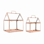 Add a chic touch to your home with this stunning set of Metal and Glass House Terrariums Featuring two assorted sizes. the modern house design paired with the chic copper finish is the perfect combination to create a timeless display The quality iron metal composition is sure to last for seasons to come Complete the look by adding a fairy garden or succulent arrangement to the home's interior