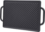 Dimensions: 13" L x 8.25" W for cooking, the total length is 15.5" (include two side handles). Material: High quality cast iron with matte coating. Package: One reversible grill griddle...