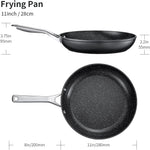 Combining with premium craftsmanship and exclusive design, we always devote to high-standard Nonstick Cookware. Product Details: Color: Black Material: Aluminum body and stainless steel handle Size: 11 inch Frying Pan Features: Multifunctional Nonstick Frying Pan Perfect for frying, meeting your every cooking need Professional Aluminum Body Sturdy and durable, 3 times harder than ordinary pots Glossy and elegant high-temperature resistant red exterior Dishwasher Safe and Oven Safe up to 500°F Durable 3-layer Non-stick Whitford Coating 100% NO toxic chemicals like PFOA Less oil used and healthier lifestyle. Quick cleaning with coveted ease, saving time and water Thickened Gauge of 4 mm Resistant to warping and denting. Solid bottom for even heat distribution and hot-spot prevention Easy Pan-to-plate transfer and drip-free pouring Sturdy Stainless Steel Handle Ergonomic design for comfortable grip. Smooth and easy to clean The hanging hole on handle is designed for hanging storage, easy to dry Stainless Steel Compound Bottom Heat rapidly & evenly, effectively distribute heat for cooking Suitable for all stovetops including induction, gas, electric, ceramic cooktops, etc.