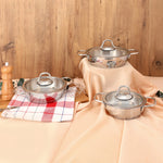 DIMENSIONS: 6 piece pan set includes 5", 6" and 7" omelette pan with tight-fitting glass lids. Please note: lids are counted as individual pieces. Tempered glass lids lock in true flavor and nutrients for tender, succulent dishes while the body-extension steel handles offer a safe and secure hold.