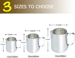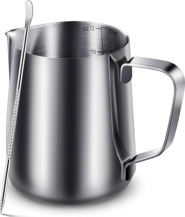 • For better drinks, Measurements on the Inside. We place U.S. and metric measurements up to 12 oz./350 mL right on the inside of our lovely Milk Frothing Jug. It is easy to read, you have to pay attention to the numbers for truly delicious drinks. Use with Espresso coffee Machines, to steam your milk or cream to be silky smooth with few bubbles, create perfect and personal latte art for your coffee or cappuccino.