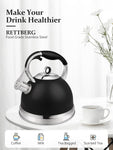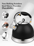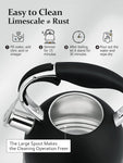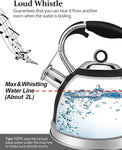 304 Stainless SteelThe inner liner of 304 stainless steel has stronger corrosion resistance and toughness, allowing the teapot to be used continuously for years without worry. | Loud WhistleWhen the water boils it will make a loud whistle that you won't forget even when you're watching TV. Note: Do not fill the water above the water level line, it may affect the whistle | 2 Ways to Fill WaterErgonomic button, 2 ways to fill the water, convenient, fast |