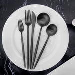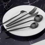| Simple and Modern This black reflective stainless steel flatware set is an easy way to add a modern touch to your table. | Comfort Handle Precision casting, thickened material, comfortable grip | Satin Finish&Round edge The edge is satin finished and smooth, not easy to breed bacteria. |