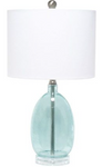 Enhance any room in your home with this simple yet chic table lamp The oval shaped base features textured clear blue glass accented with brushed nickel and a white fabric drum shade Perfect for your living room. bedroom. office. or anywhere you need to add a tasteful update!