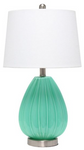Illuminate your space with this chic and charming table lamp The seafoam glass base is curvy and accentuated with a pleated design topped off with a white fabric shade Perfect for your living room. bedroom. office. or anywhere you need to add a tasteful update!