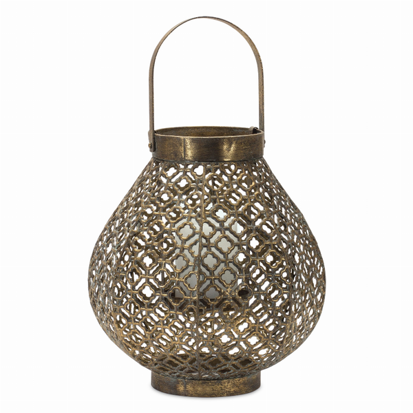 Illuminate your home with this beautiful Ornamental Metal Lantern The chic golden finish paired with the geometric cut out design makes this piece a great additon to your boho or chic-antique home D?cor The quality metal composition is sure to last for seasons to come Complete the piece by adding a real wax or LED candle to the inside of the lantern