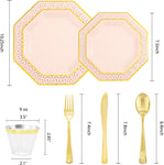 - A SET OF TABLEWARE:The complete set of disposable pink and gold dinnerware with cups, include: 25 dinner plates, 25 dessert plates, 25 cutlery, 25 cups. You won't have to worry at all about running out of cutlery for the party.