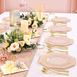 - Party Dinnerware: Use this set of gold disposable dinnerware to entertain distinguished and close friends at dinner time, making a perfect party dinner.To add a sense of ritual to our lives.