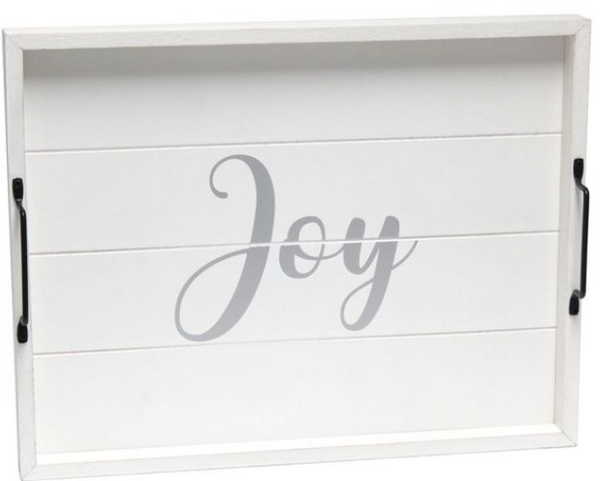 Freshen up your home with this white wash wooden tray! Accented with black metal handles and silver text this tray is on trend to give your home that cozy farmhouse feel Use to serve breakfast in bed. food and drinks at a party or makes for an excellant centerpiece for your dining table. kitchen counter. coffee table or ottoman