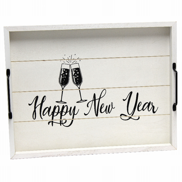 Freshen up your home with this light gray wooden tray! Accented with black metal handles and black text beside a set of champagne glasses graphic. this tray is on trend to give your home that cozy farmhouse feel Use to serve breakfast in bed. food and drinks at a party or makes for an excellent centerpiece for your dining table. kitchen counter. coffee table or ottoman