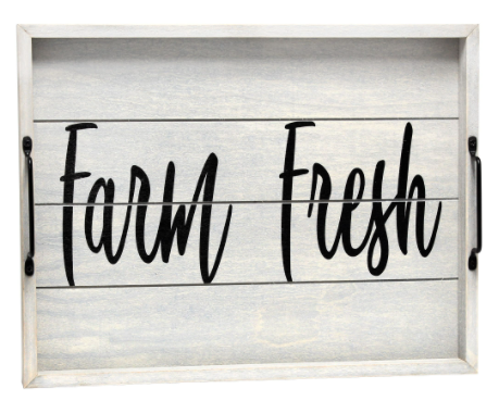Freshen up your home with this gray wash wooden tray! Accented with black metal handles and black text this tray is on trend to give your home that cozy farmhouse feel Use to serve breakfast in bed. food and drinks at a party or makes for an excellant centerpiece for your dining table. kitchen counter. coffee table or ottoman