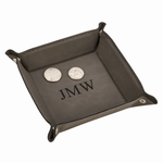 Every guy needs a place to empty out his pockets at the end of the day. whether it is coins. keys. or other items Our grey leatherette snap valet tray is the perfect gift The four corners snap together to allow the tray to lay flat for easy packing if you would like to take it on the road with you The dimensions are 5 x 5 x 15 when snapped and 65 x 65 when laying flat This item can be laser engraved with the engraving appearing as black Gift Boxed