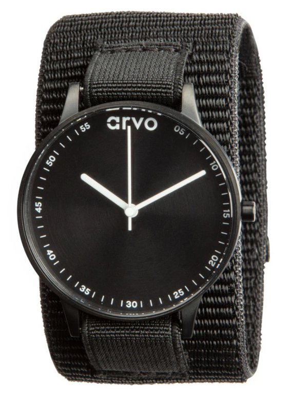 Stainless steel matte 38mm black plated case Matte stainless steel case back 7mm thick case Hardened mineral glass Swiss Quartz Movement. 3 hands 3 ATM water resistance Black watch strap with hook and loop fastener Country of Origin:- China