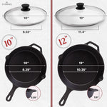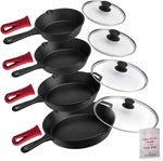 6"+8"+10+12"-Inch Cast Iron Skillets Set + Glass Lids + Silicone Handle Grips - Pre-Seasoned Frying Pan - Oven Cookware - Use Indoor/Outdoor, Grill, Stovetop, Fire, Camping, Kitchen