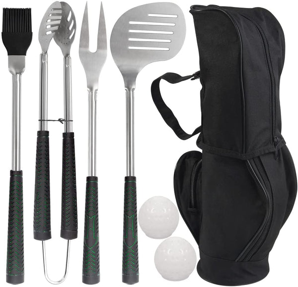 Unique and Basic Golfers grill set: The 7pcs golf bbq kit includes golf-club style barbecue spatula, power tongs, grill fork, 2 Golf-Ball Style salt & pepper shaker, silicone basting brush...