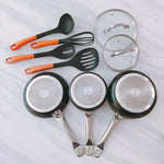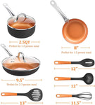 9 Pieces Set: The collection includes 9.5 inch Fry Pan with Lid, 8 inch Frying Pan, 2.5 qt. Saucepan with Lid, Silicone Whisk, Ladle, Slotted Spoon, and Slotted Skimmer, satisfying...
