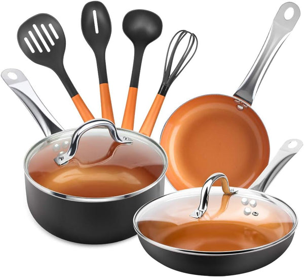 9 Pieces Copper Nonstick Pans Pots Ceramic Cookware Set Copper Pans and Pots Nonstick Pots and Pans Copper Nonstick Cookware, Ceramic Pot and Pans, Copper Pots and 4 Set Cooking Utensils