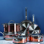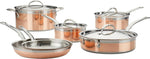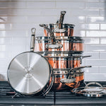 For ground breaking innovation, ultimate performance and modern elegance, equip the kitchen with a Hestan CopperBond Induction Copper Cookware Set. This ultimate set includes a curated assortment of the most often used pieces to accommodate a wide range of recipes and techniques. Lids are interchangeable and will fit the skillets. Handcrafted in Italy to meet the highest quality standards, the Hestan CopperBond collection combines the unsurpassed conductivity. The responsiveness and beauty of copper with the durability and clean-ability of stainless steel provides superior cooking performance on all cooktops, including induction. Avoid using steel wool, scouring pads or harsh detergents. Copper will develop a natural patina over time. To restore the shiny appearance, use a copper polish and dry thoroughly with a clean soft cloth.