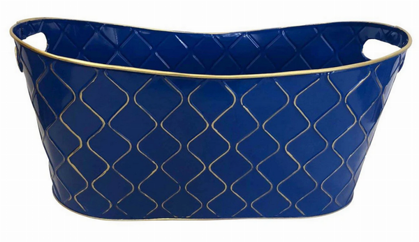 Check out our royal blue metal container with attractive and classic embossed golden trellis pattern It features cut out side handles making it easy to carry and transport Many possible...