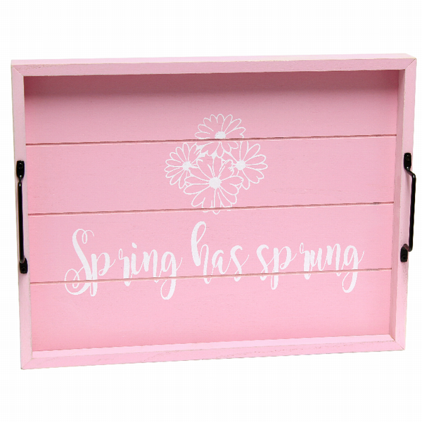 Freshen up your home with this light pink wash wooden tray! Accented with black metal handles and white text beside a flower graphic. this tray is on trend to give...