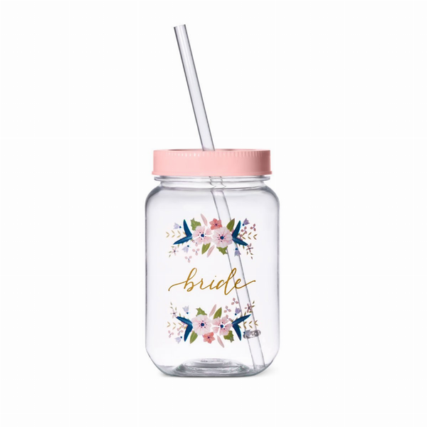 These plastic mason jars are a great addition to bachelorette parties! Each mason jar is 16 oz and has a pink lid with gold-tone script and a flower design Resuable...