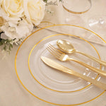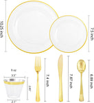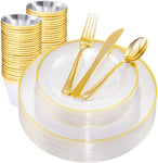 SUT 150 PCS Gold Plastic Plates, Disposable Clear Gold Dinnerware Set with Cups, Includes: 25 Dinner Plates, 25 Dessert Plates, 25 Cutlery, 25 Cups, Prefect for Party, Wedding & Shower